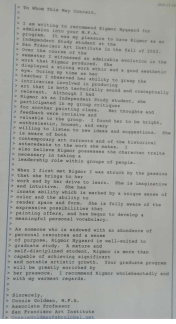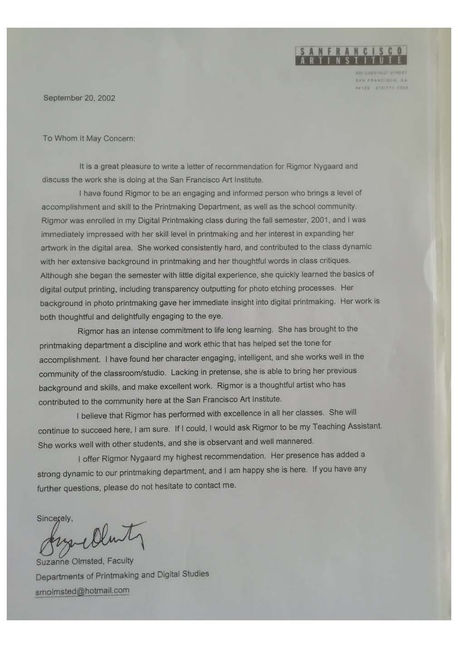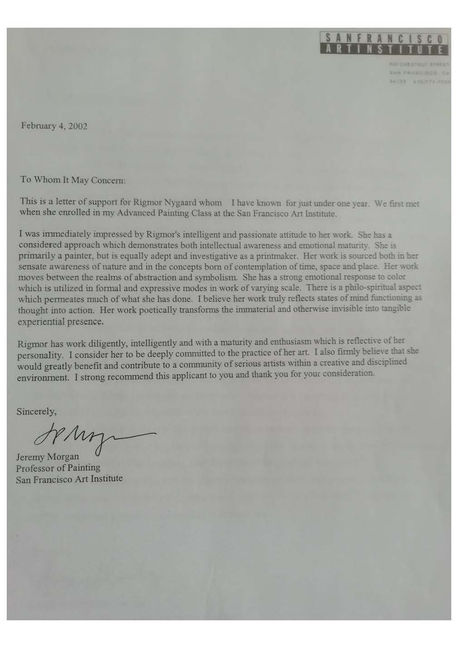 Attest #1 Jeremy Morgan | Professor of Painting San Francisco Art Institute Attest #2 Suzanne Olmsted | Faculty San Francisco Art Institute | Departments of Printmaking and Digital Studies Attest #3 Connie Goldman | M.F.A San Francisco Art Institute | Associate Professor